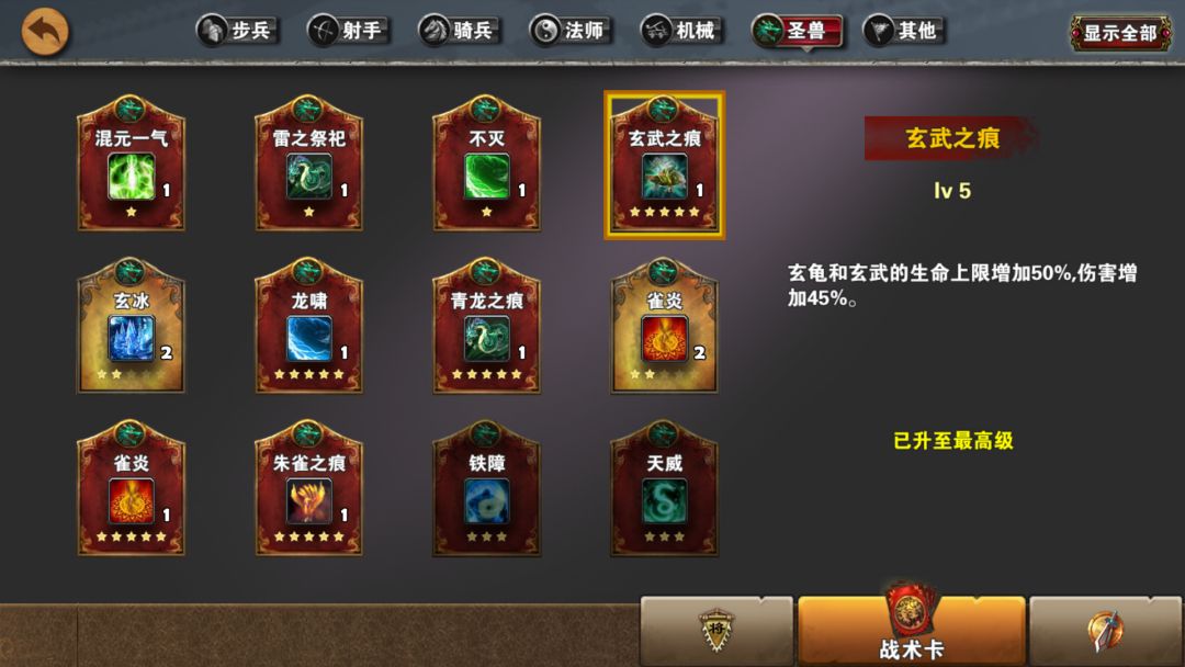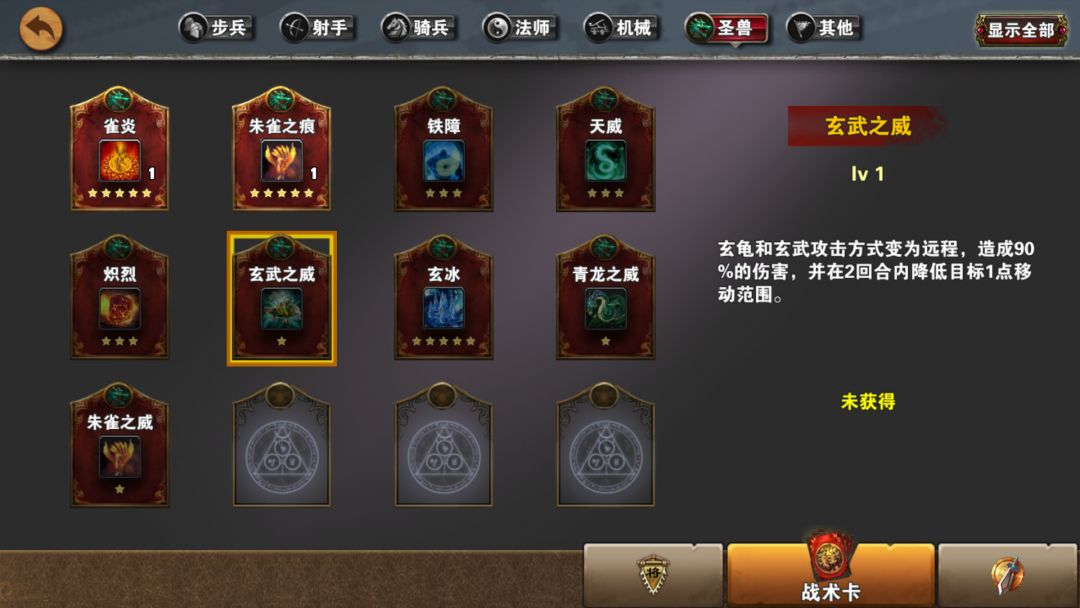 玄武若无玄武之威,攻击靠爬很不靠谱,所以有张玄武之威,提供了远程攻击。这张卡是v8拿的,往往配合铁幕使用,常用于太史连携,贾诩等龟缩阵。另外配合真武荡魔剑,可多个3星的玄武之痕效果。