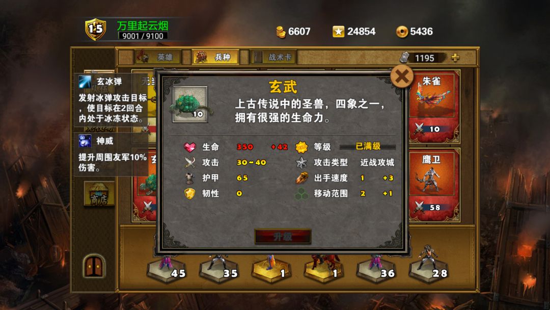 玄武,超高的血和护甲,攻击较青龙朱雀低。移动和手速还特别低。有两个技能,玄冰弹,冰敌2回合,冷却4回合。神威,提供1格范围友军10%伤害。