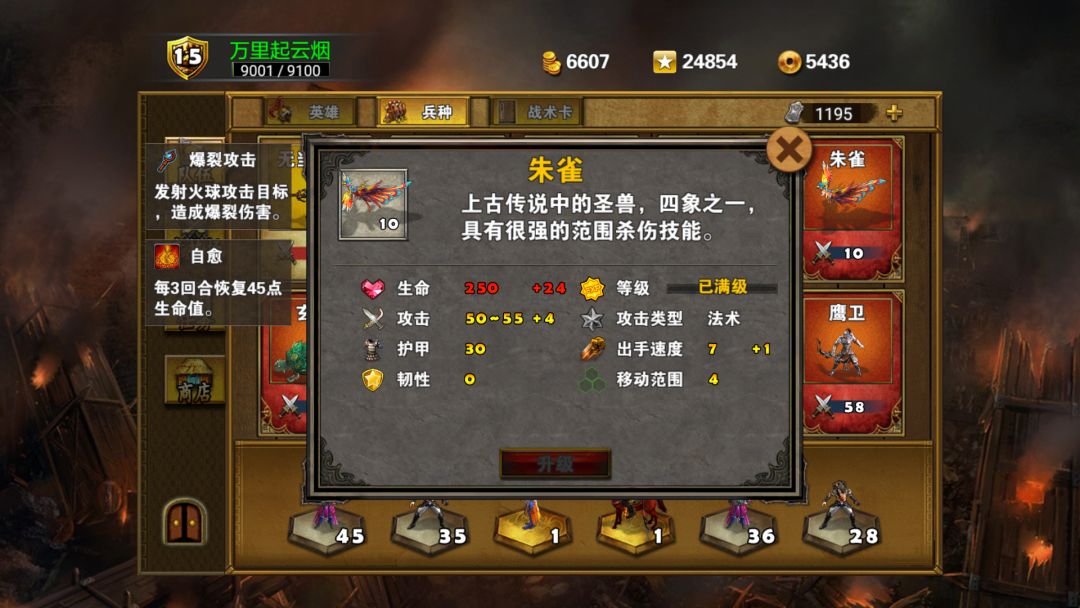 朱雀的血量和护甲比青龙稍低一点,攻击力和青龙一样,打的普攻是远程范围伤害。有被动技能自愈,每三回合初恢复45点生命。