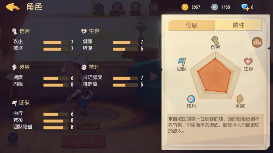 健康是7与剑杰血量相同(三刀),回复5虽然回复慢,但是可以回血,而剑杰不能自动回复,躲闪能力8,与罗宾肩并肩,剑客家族通病:推速5,团队配合方面都比较突出,可以溜猫(废话🌚🌚)