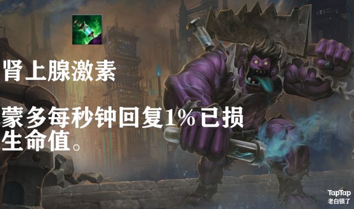 蒙多的被动技能叫做肾上腺激素,效果是每秒钟回复1%的已损生命值,这个被动对于使用技能消耗生命值的蒙多来说能提供非常多的补益,大大地提高了蒙多的续航能力和生存能力。