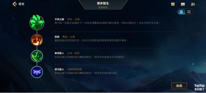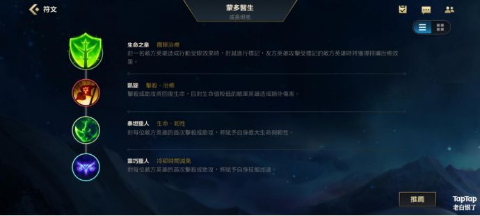 符文方面主系老白推荐大家带不灭之握或者生命源泉,前者可以配合平A在对线期打出消耗和回复,适合走上单的蒙多,后者则能够让友方在攻击被蒙多施加减速效果的英雄时获得回复效果,适合打野位的蒙多。副系第一栏选择凯旋来提高蒙多的续航能力,第二栏选择泰坦猎手提升坦度,最后一栏则选择天生猎手来获得技能急速,进一步减少蒙多的技能CD。