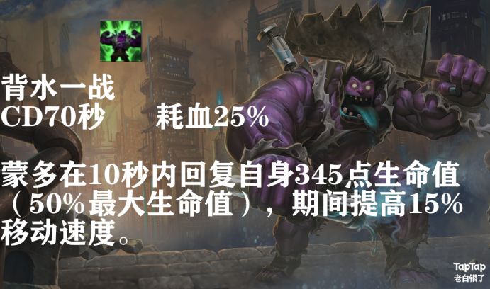 蒙多的大招背水一战是一个非常强力的回复技能,在使用后会立即消耗25%的当前生命值,并在10秒内持续回复最大生命值并提高移动速度。虽然从技能效果上来看,低血量使用大招是比较赚的,但老白还是建议大家不要把蒙多大招当蛮王大招用,否则被秒掉可就欲哭无泪咯!
