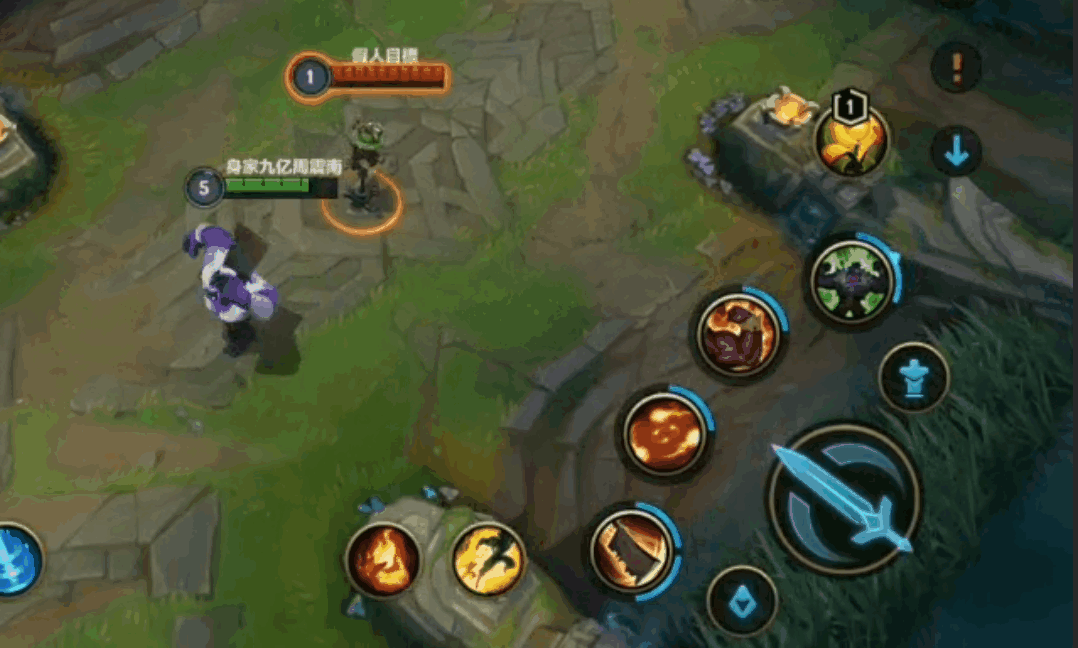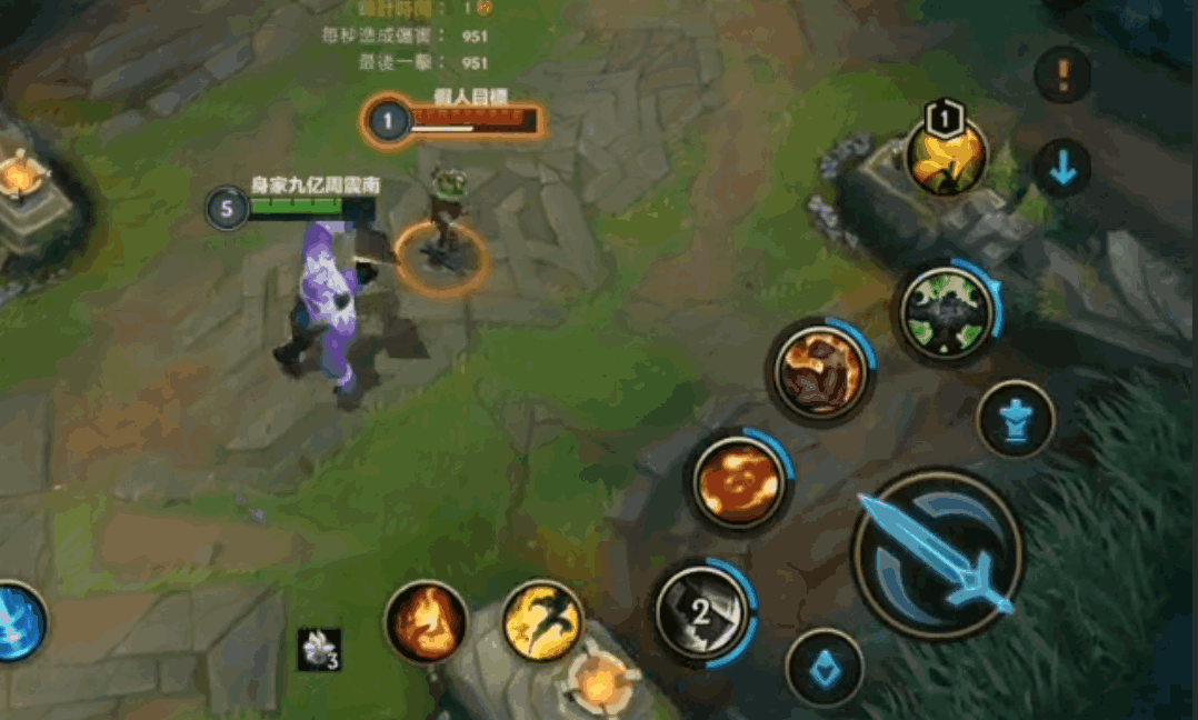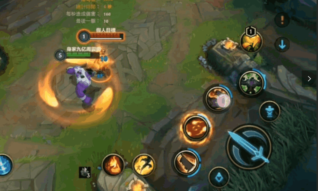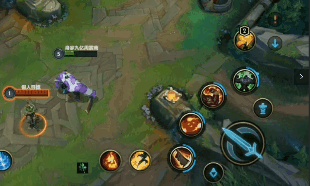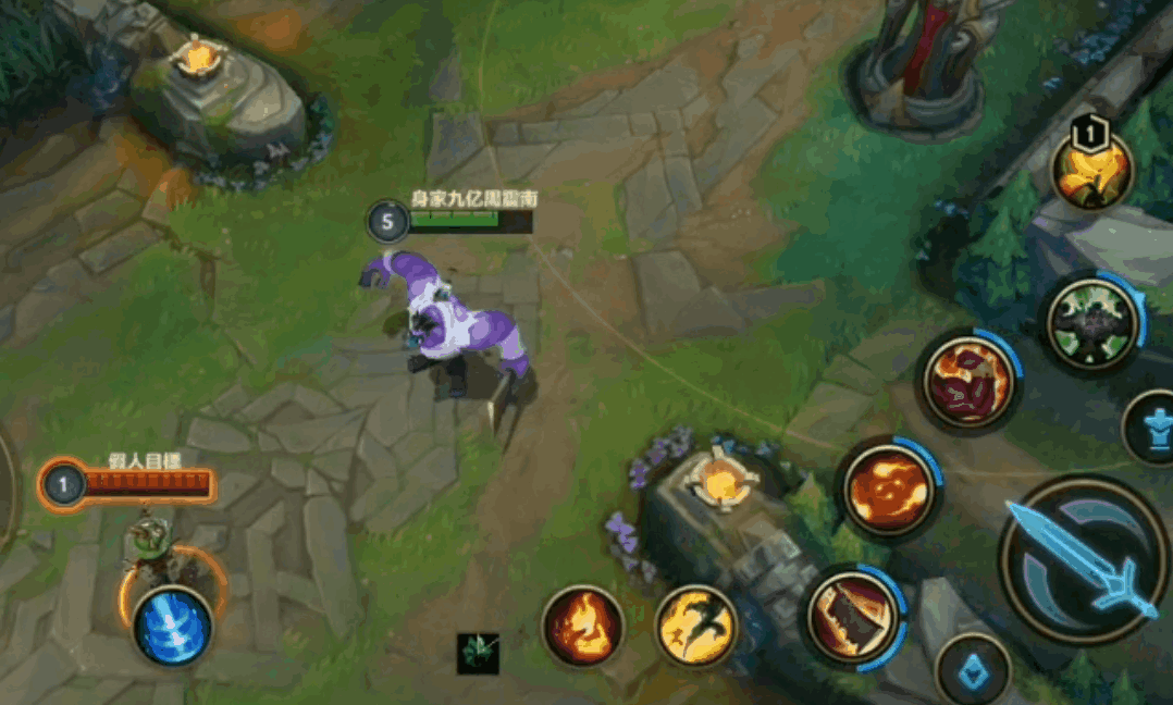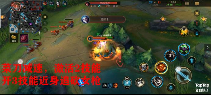 讲完基础部分,我们再来过一段实战吧!这一局老白的打野蒙多已经处于非常大的优势之下,装备豪华,等级压制,看到对面野辅离女枪有一段距离,果断上前一记1技能菜刀减速,随后开启2技能后再开3技能近身追砍女枪。