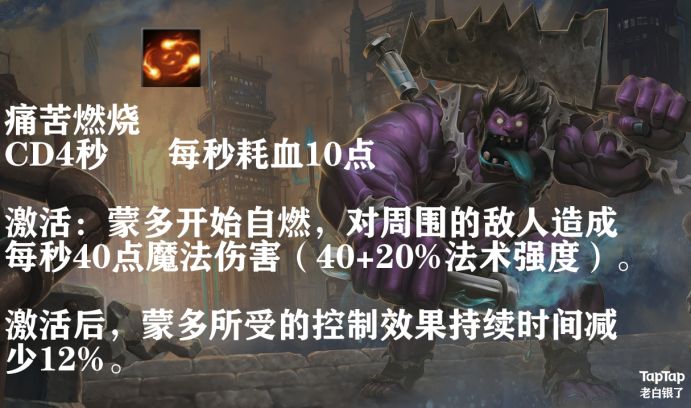 蒙多的2技能痛苦燃烧在开启后会持续消耗蒙多的生命值来对他周围的敌人造成伤害,并减少蒙多所受的控制时间,这个技能可以让蒙多在冲锋陷阵的同时持续伤害周围的敌人,是蒙多的主要aoe技能。