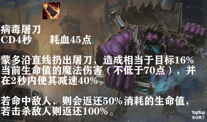 蒙多的1技能病毒屠刀在使用后会沿直线扔出自己的屠刀,造成基于目标当前生命值的魔法伤害并减速,命中或者击杀都会返还技能消耗的生命值。这个技能是蒙多的主要消耗技能,在追击和逃跑时也能发挥不错的作用,还可以跟小伙伴开自定义在龙坑互扔飞刀玩!
