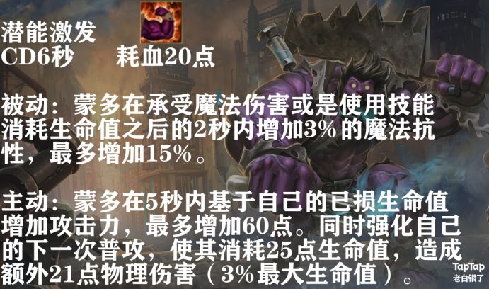 蒙多的3技能潜能激发分为主动和被动两个部分,被动效果是让蒙多在承受魔法伤害或使用技能后叠加魔抗,主动开启则会增加他的攻击力并强化下一次普攻造成额外伤害,这个技能是蒙多的主要爆发技能,非常适合拿来对拼。