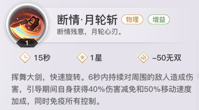 【断情月轮斩】群体高频率伤害技能,重点是持续时间内减伤免控。一般配合【血绽诀】进行高额吸血,或在跟玉虚流光对打时用来规避控制,保证持续近身状态。