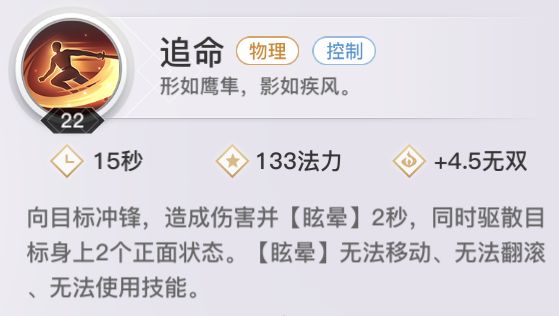 【追命】单体控制技能,可驱散敌人buff,是光刃近身的重要手段。