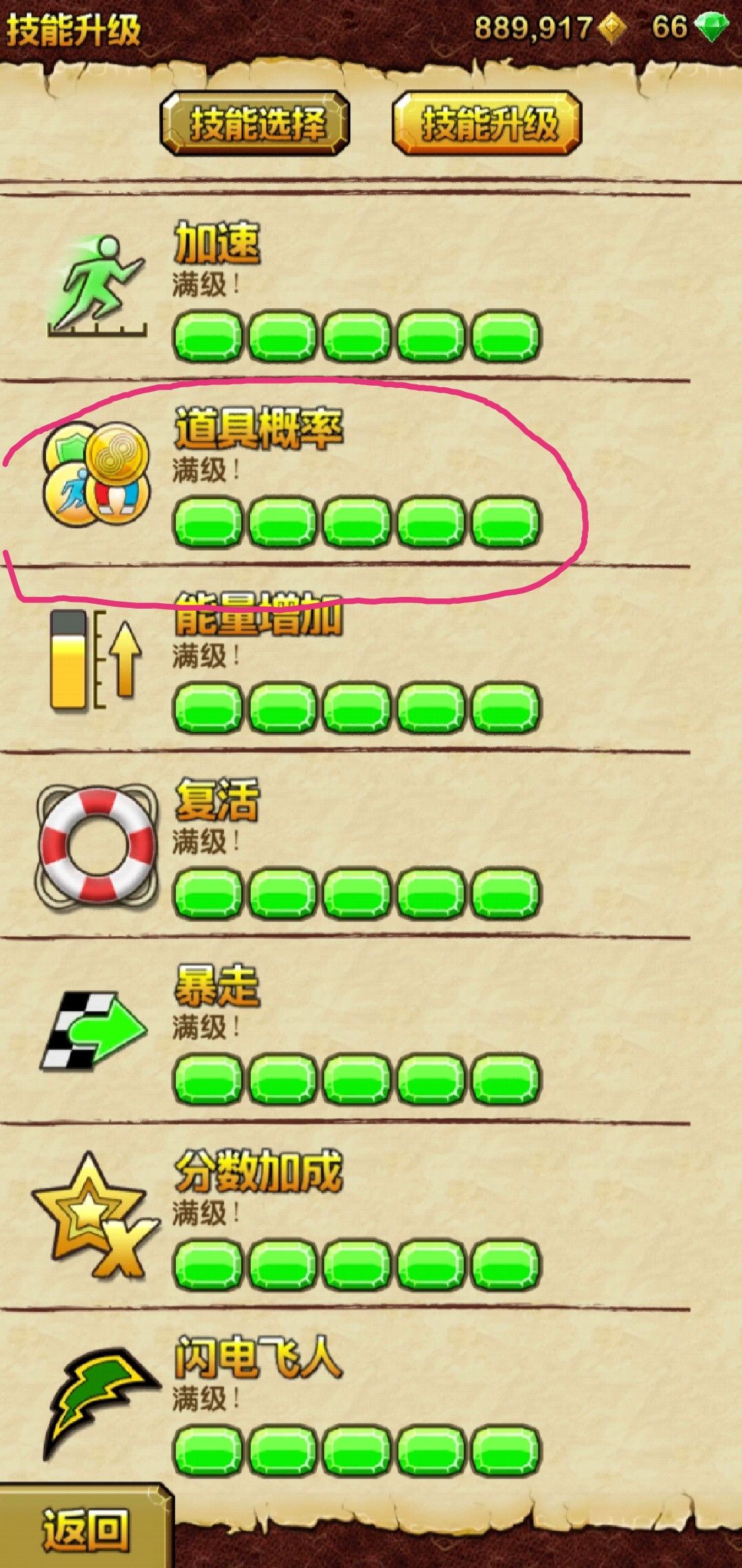 不管哪个渠道下载的,一定要先把[技能升级]里面的道具概率升到满级。以便得到最基础的道具出现概率。