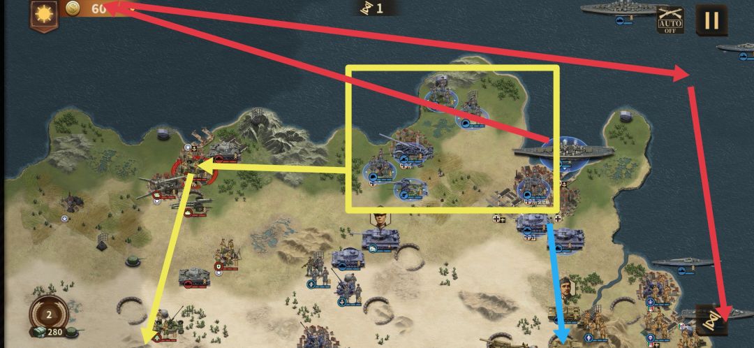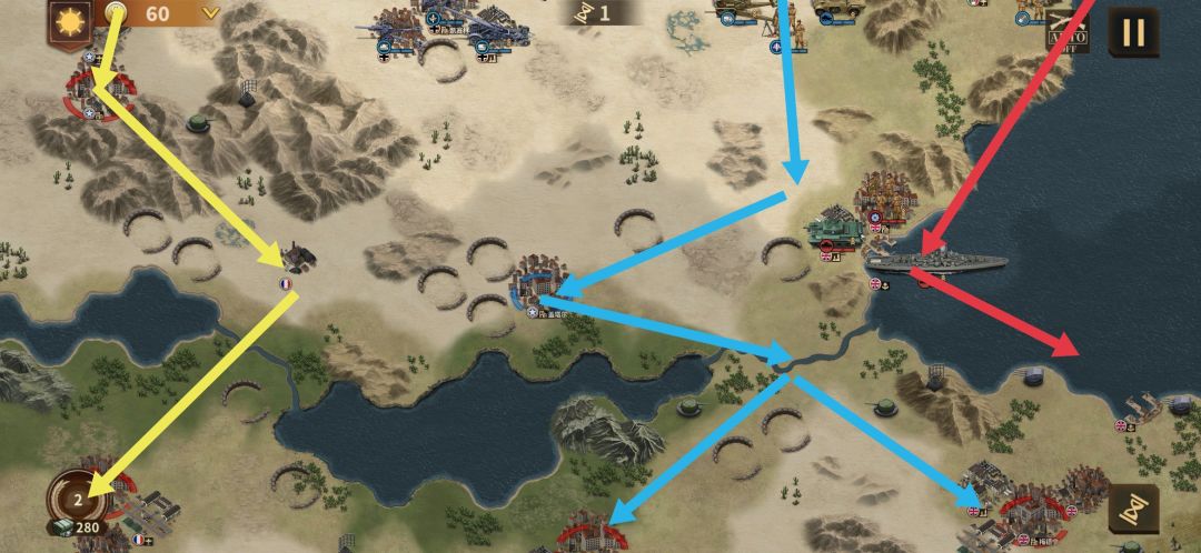 黄线为步兵+炮兵组合部队,主要作用为掩护隆美尔,使隆美尔可以输出艾总并将其击杀。随后南下占领左侧所有红圈城。(重炮可视情况行动,推荐狙掉巴顿)