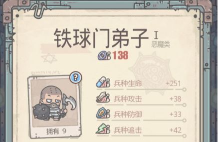 铁球门弟子 恶魔 结识小伙伴:朴巨汉、朴巨姬小伙伴30级对应兵种能力:每上阵10个部队攻击+300