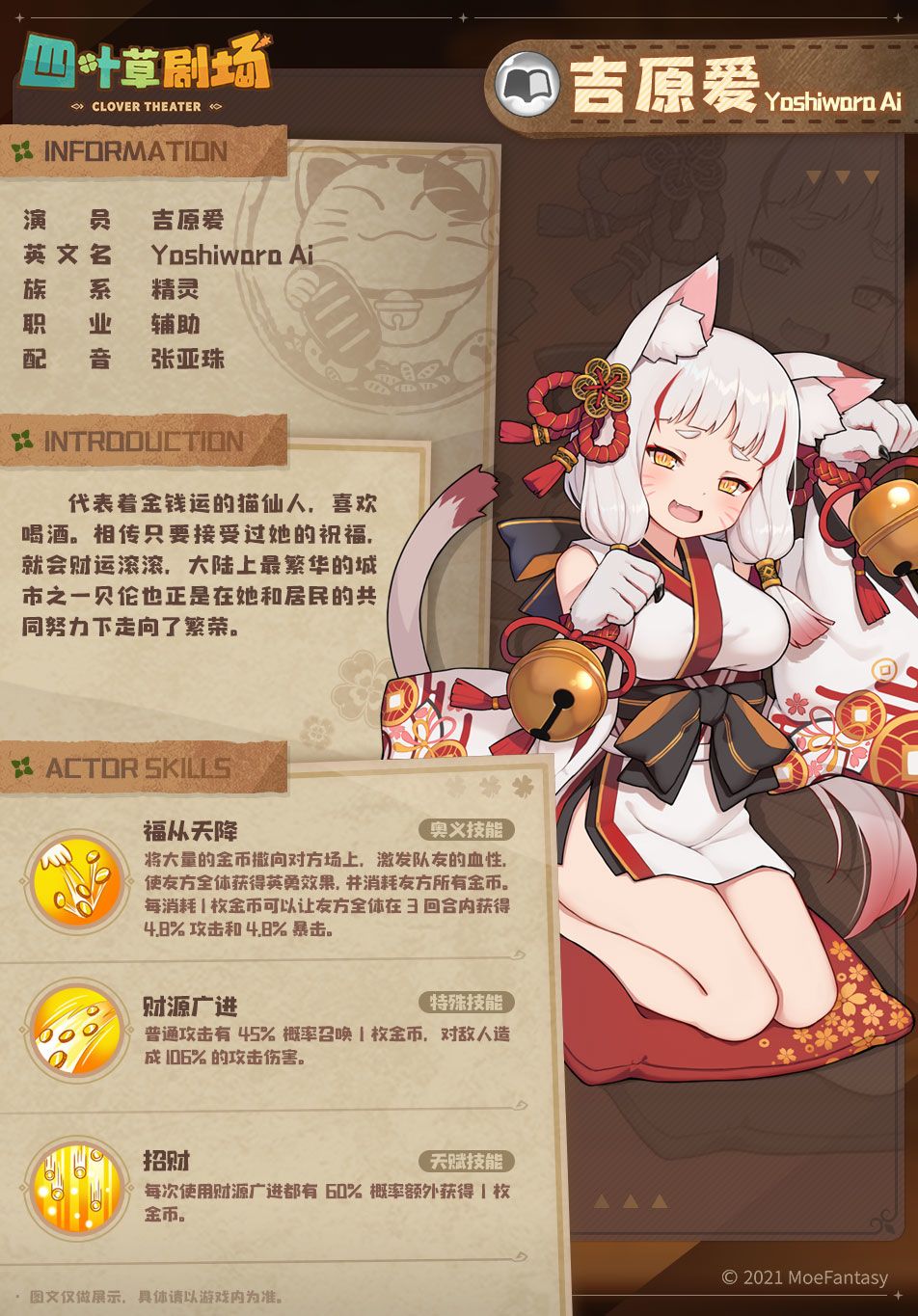 代表着金钱运的猫仙人,喜欢喝酒,相传只要接受过她的祝福,就会财运滚滚,大陆上最繁华的城市之一贝伦也正是在她和居民的共同努力下走向了繁荣。