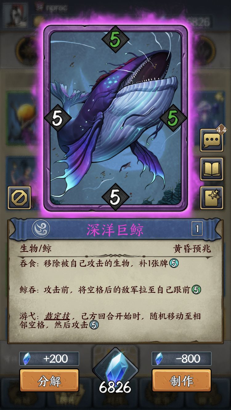 深洋巨鲸:强力的解牌2,潜袭的沉默效果不能影响锁定技,这时候就需要巨鲸出场了,鲸吞的拉怪效果还可以配合深海兽,一般巨鲸和猎杀兽都能解场的情况下,我会先下巨鲸补一张牌。常见的解场对象:帷幕、坚韧、强横、跃离(靠拉怪效果)、逃逸,神秘的水母(靠拉怪效果),恐惧的夺魂女妖、冥府仆役,炼狱的矿脉元素、血腥教徒。