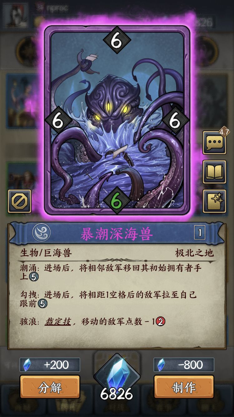 暴潮深海兽:用法很多,可以回手溃败敌军,利用拉怪效果解场,对手手牌满的时候回手敌军,劣势的时候搅局等等。前期用巨鲸或猎杀兽解场时,可以放在只有上下或左右两个相邻空格的地方,如果对手置于相邻将这张卡翻面,你可以上深海兽回手溃败敌军,然后拉怪攻击上回合上场的敌军。