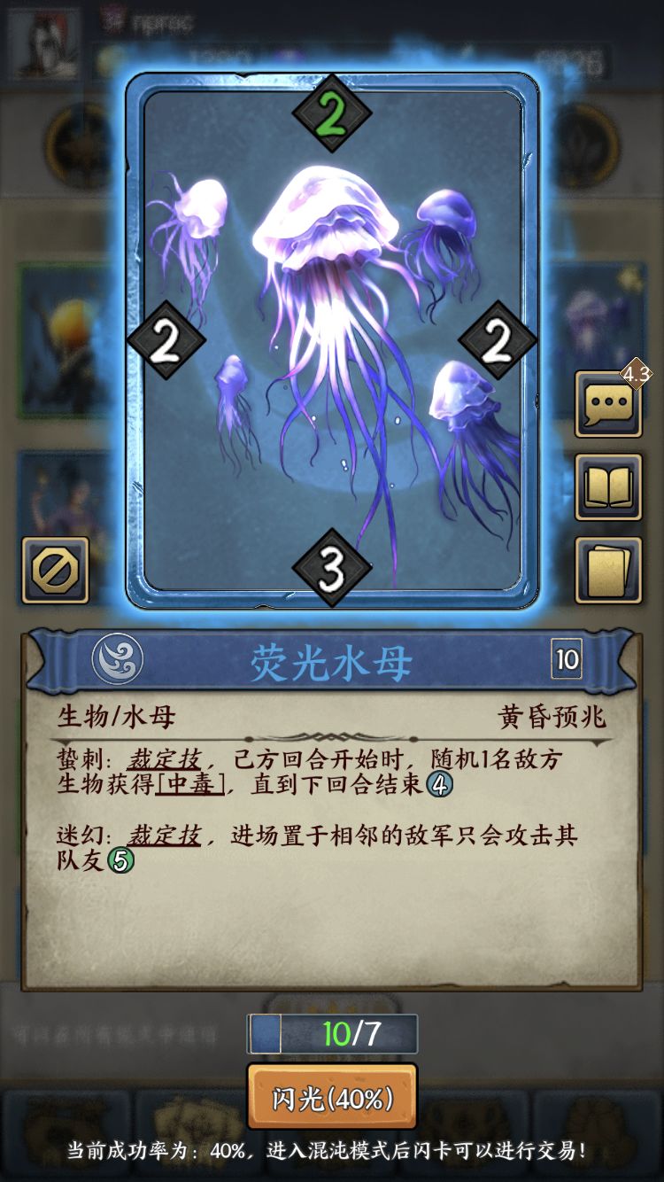 水母:卡位能力强,中毒可以解大怪,一般先手用来打钉子,友军放在水母的斜对角可以被保护。当然被解的情况也有很多,比如非相邻的攻击(射击、贯矢、箭矢、穿刺),移动后攻击(突袭、秩序的雪橇领队、神秘的深海兽和巨鲸、中立的船),进场后失去技能(潜袭、伪装),技能触发相邻位置攻击(践踏,秩序的传令官和巨鹰)等等,总之被花式解几次就懂了。另外尽量不要造出一个孤立的空位(周围没有相邻的空位),对手可以放一个有持续效果的卡,可能因为解不了就输了。