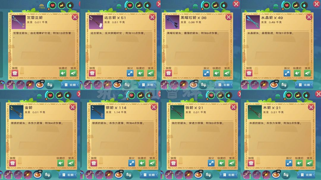 首先,创造与魔法里面有八种箭头和八种弓,每一种弓和箭头都有不同的伤害