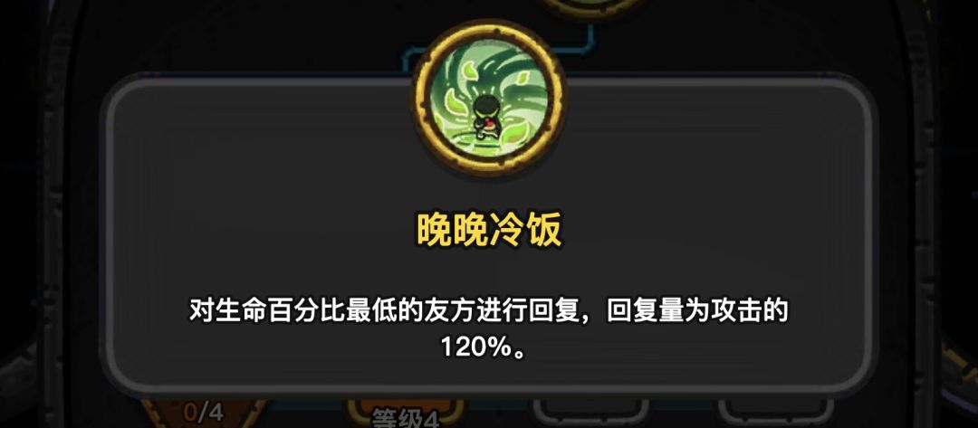 增加技能回复的百分比;给另外一个生命百分比低的队友(经理)回血,回血量是攻击的百分比;回复目标溢出的回复量转变为护甲,护甲可以抵消一部分伤害,护甲上限是攻击的的百分比