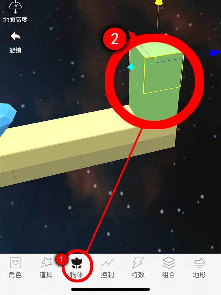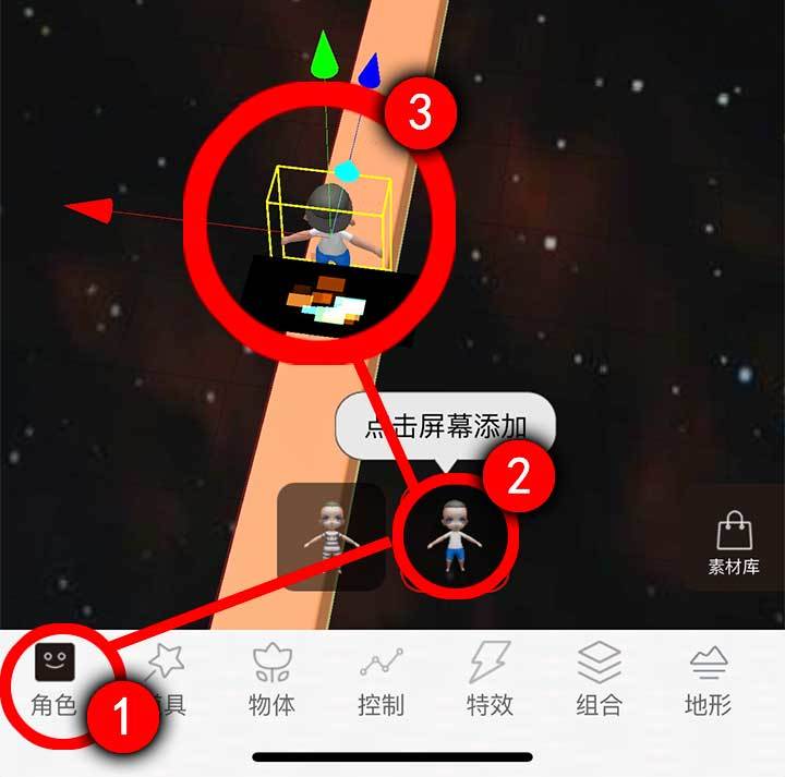 因为要将搭建道路的物体添加到场景中,所以进入物体素材库后,点击上方的项目素材按钮,将项目素材里的绿方块(拼接1)添加至舞台,因为是障碍物块,所以要摆放至黄色块的上、下、左、右(四方向可任选,但是一定要留空的,方便人物通过)