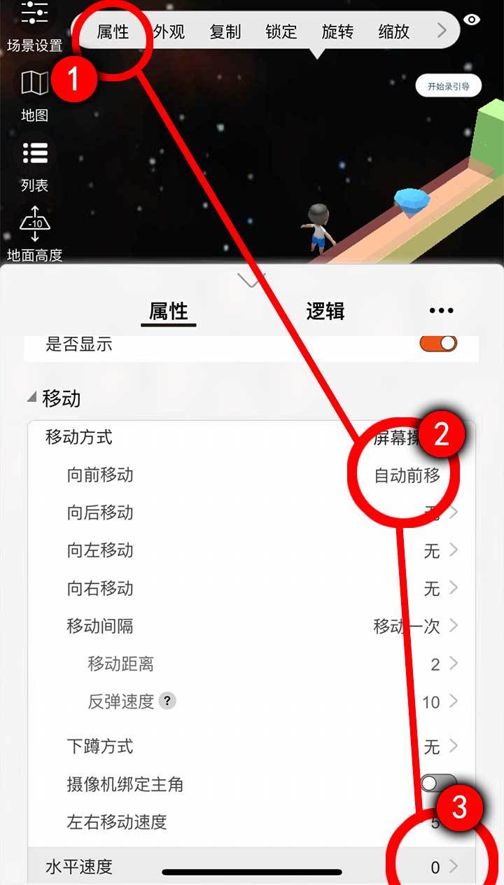将主角放置到场景中,然后设置主角的移动方式,将向前移动设置为自动前移,并且水平速度设置为0(因在外部有逻辑控制,所以速度设置为0最好,也可设置为10);