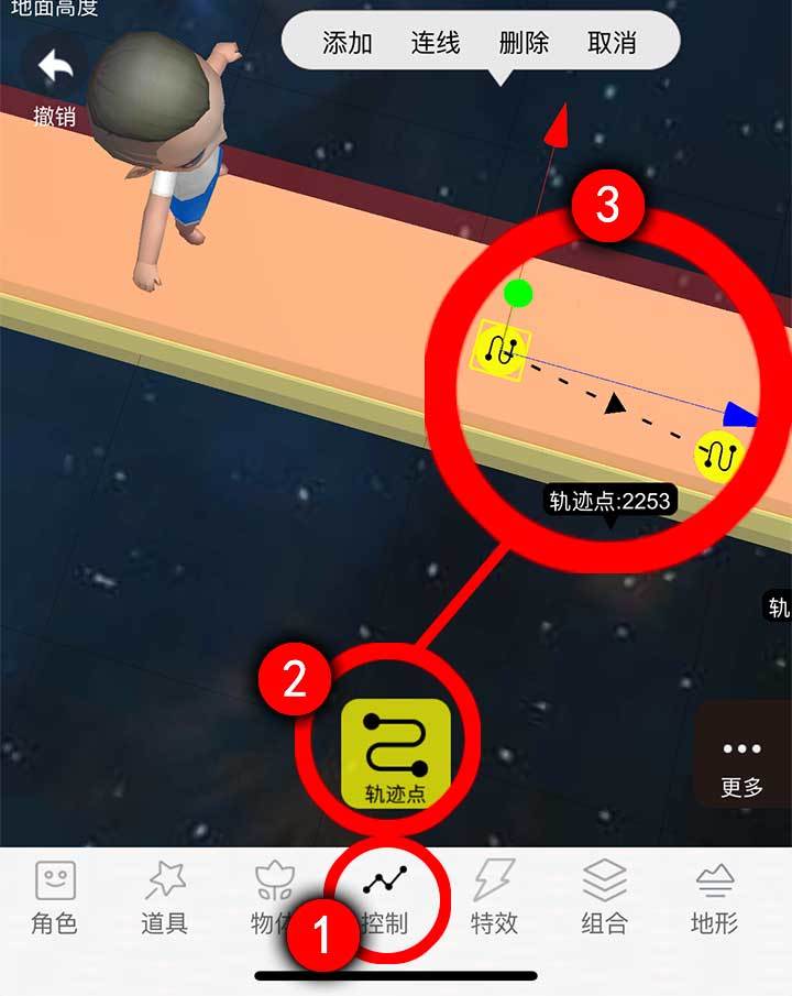 当你放置好NPC后,接下来设置能让NPC动的轨迹点,点击控制按钮,点击轨迹点控制器,将其添加到舞台,因需要让NPC按照你设置的道路走,所以你需要将两个轨迹点中间的线长度与你的道路长度相等。