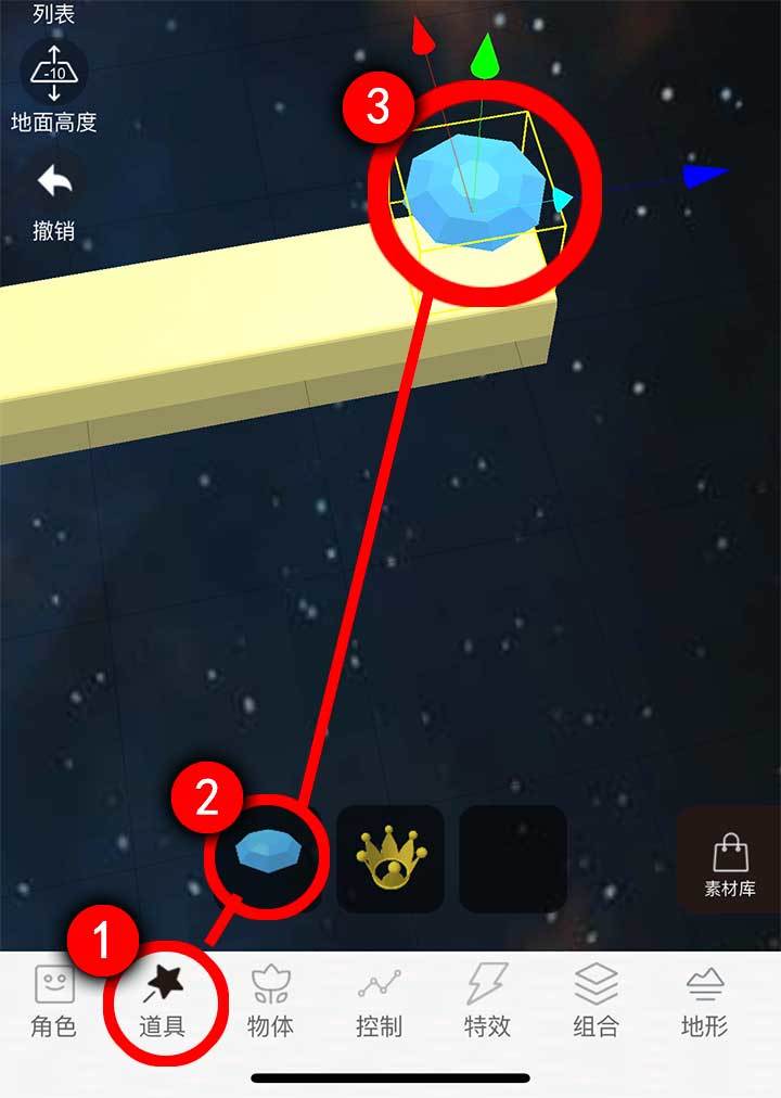 将道路搭建完后,接下来打开道具的素材库,点开项目素材,点击钻石道具,将其添加至场景中;注意的是,需要将钻石道具与黄色块对齐;因为钻石道具与商店里的金币道具属性一样,只是修改了外观。所以就不在此放属性图了。
