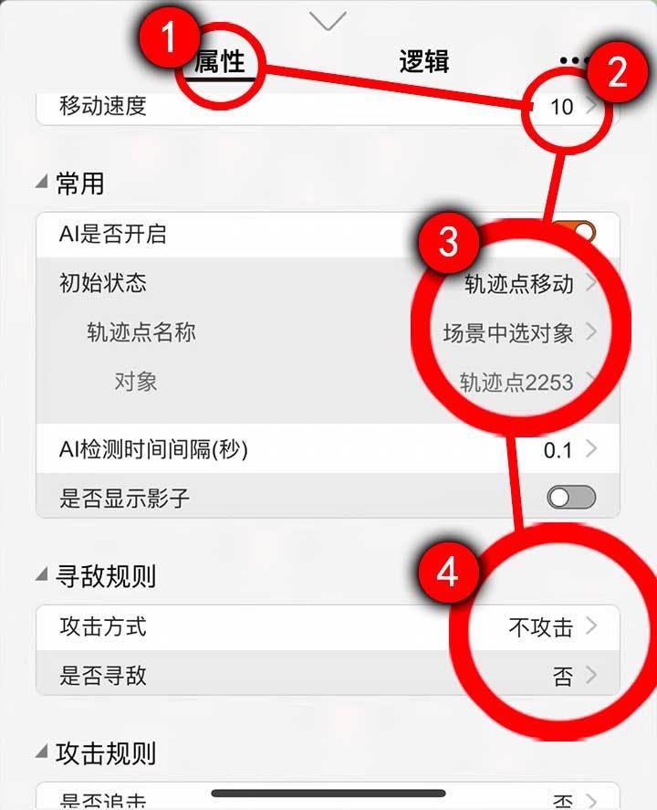 设置好轨迹点后,再次点击NPC的属性,设置初始状态,将初始状态设置为轨迹点移动,并且点击选择你刚才设置的轨迹点对象。移动速度设置为10;并且攻击方式设置为不攻击,是否寻敌设置为否。
