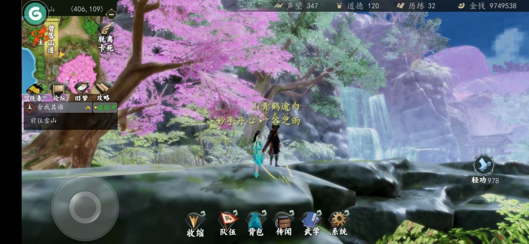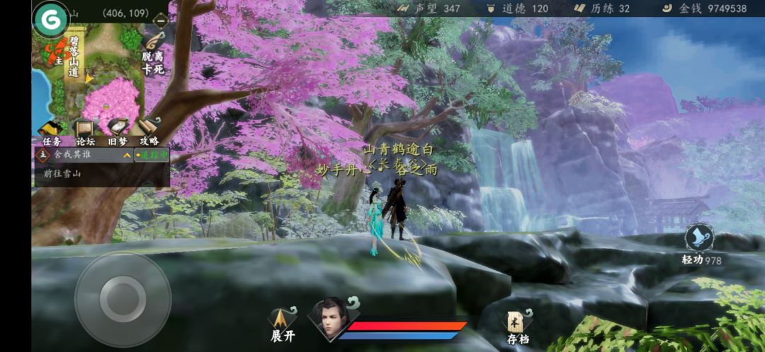 在碧落山这里偶然登上这个有桃花树的平台。除了剧情、武学、心法等之类的可以改进之外。突然想到,还可以有场景画质的优化,就是可以设置拍张这样的功能,在一梦江湖(有没有我忘了,玩的少)神都夜行录(拍照影响深,可能很少人玩)等这样游戏中应该可以参考。