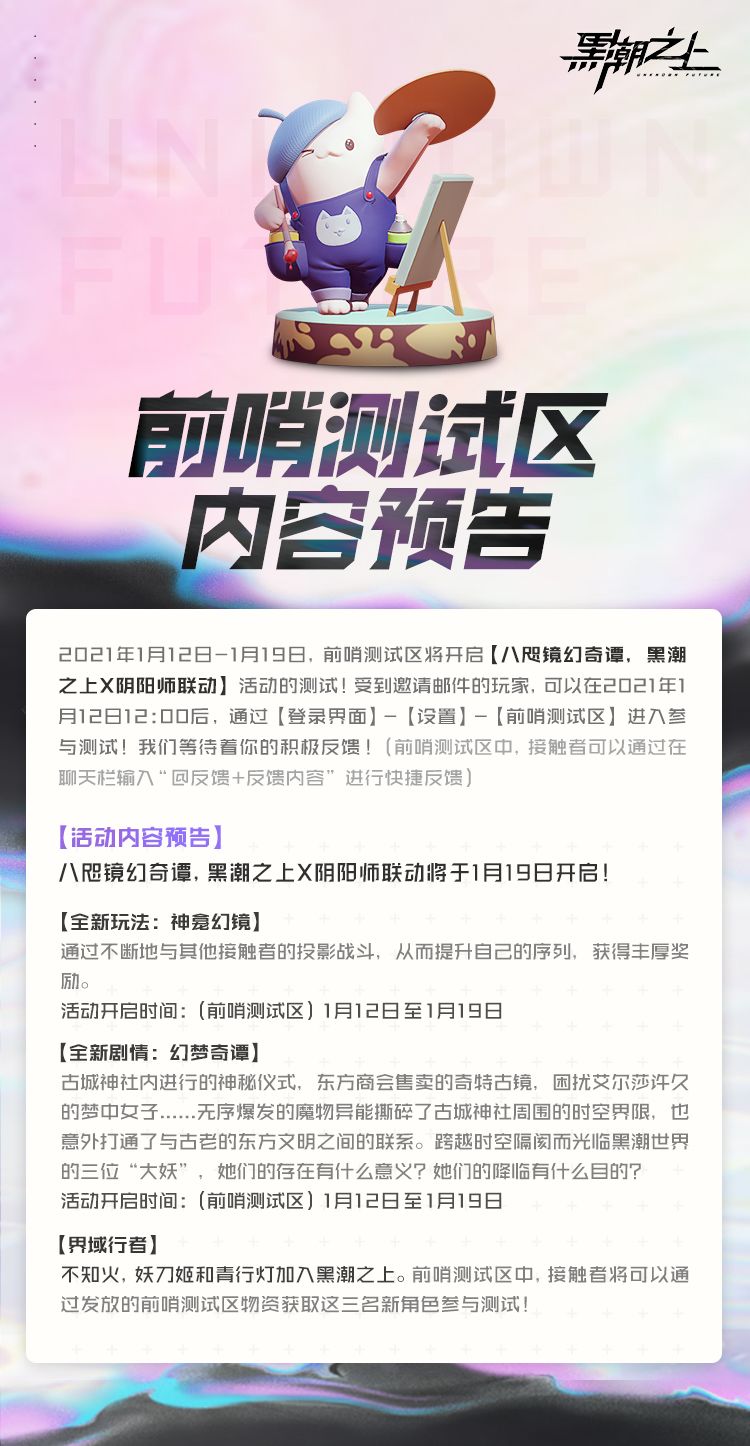 2021年1月12日~1月19日,前哨测试区将开启【八咫镜幻奇谭,黑潮之上X阴阳师联动】活动的测试!受到邀请邮件的玩家,可以在2021年1月12日12:00后,通过【登录界面】-【设置】-【前哨测试区】进入参与测试!我们等待着你的积极反馈!