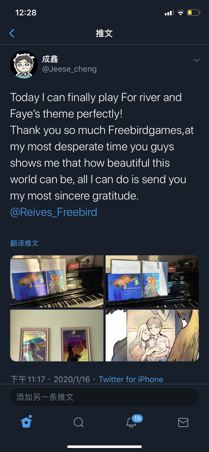 18年的时候终于有了时间,为最爱的两个游戏《To the moon》和《Finding Paradise》学了钢琴,苦练学会了for river (To the moon)的时候真的控制不住自己的泪水,还在推特得到了高瞰大大的赞 (ttm和fp有的配乐真的好难,其实是我太笨)小房间里除了ttm 就是fp哈哈哈