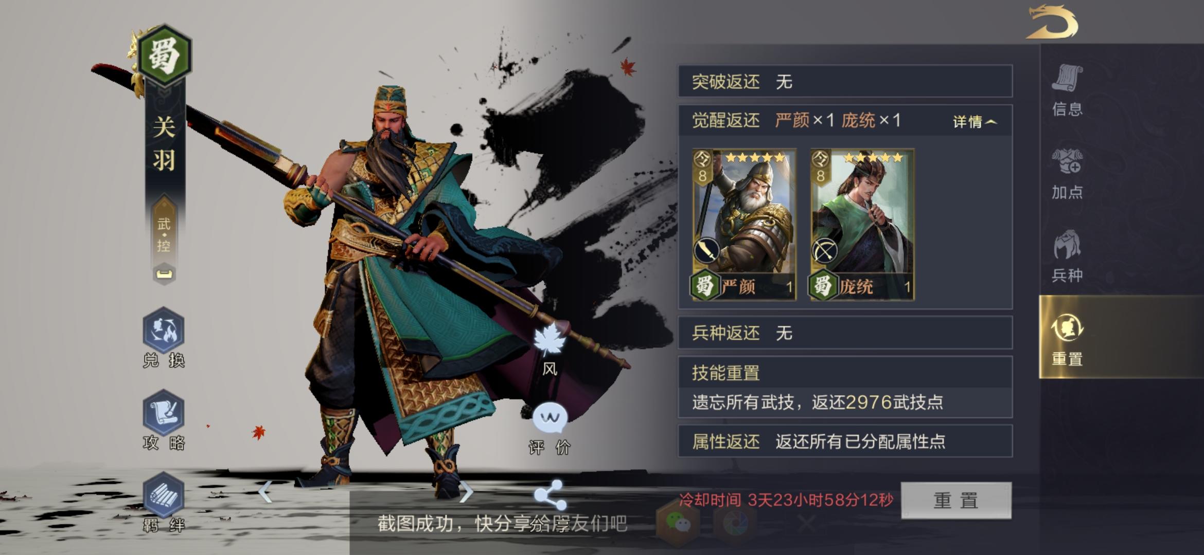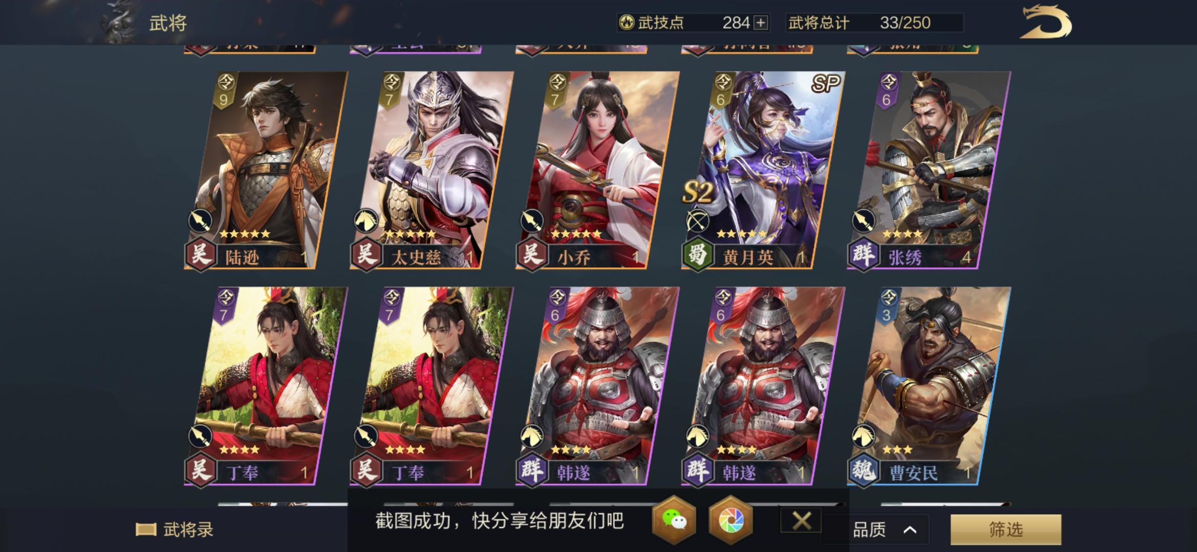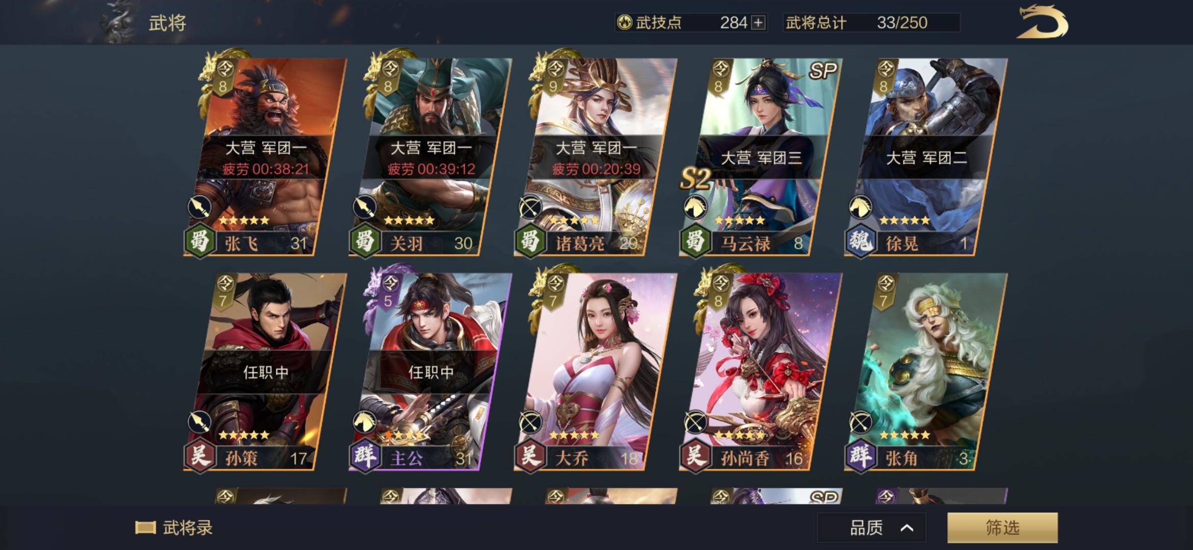 武将和武技都在这里,现在玩的是诸葛加关张。本来想着有抵挡有减伤有净化,想得太全结果一打地战损高得可怕伤害又低,六级打了好几次才打过一个。
