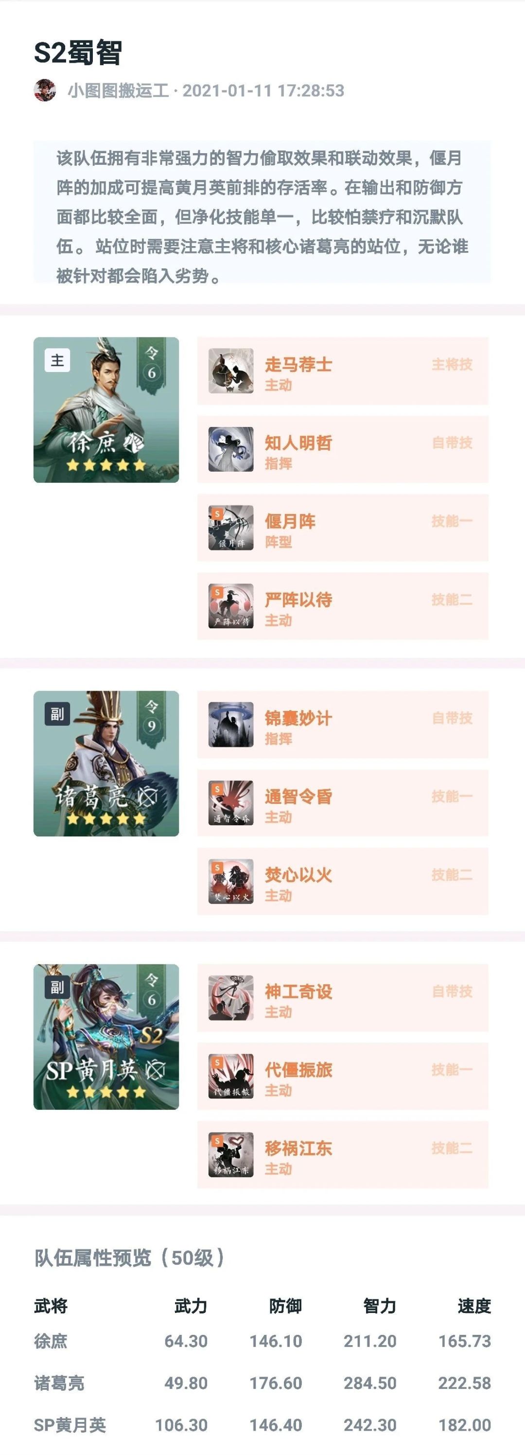 该队伍拥有非常强力的智力偷取效果和联动效果,偃月阵的加成可提高黄月英前排的存活率。在输出和防御方面都比较全面,但净化技能单一,比较怕禁疗和沉默队伍。