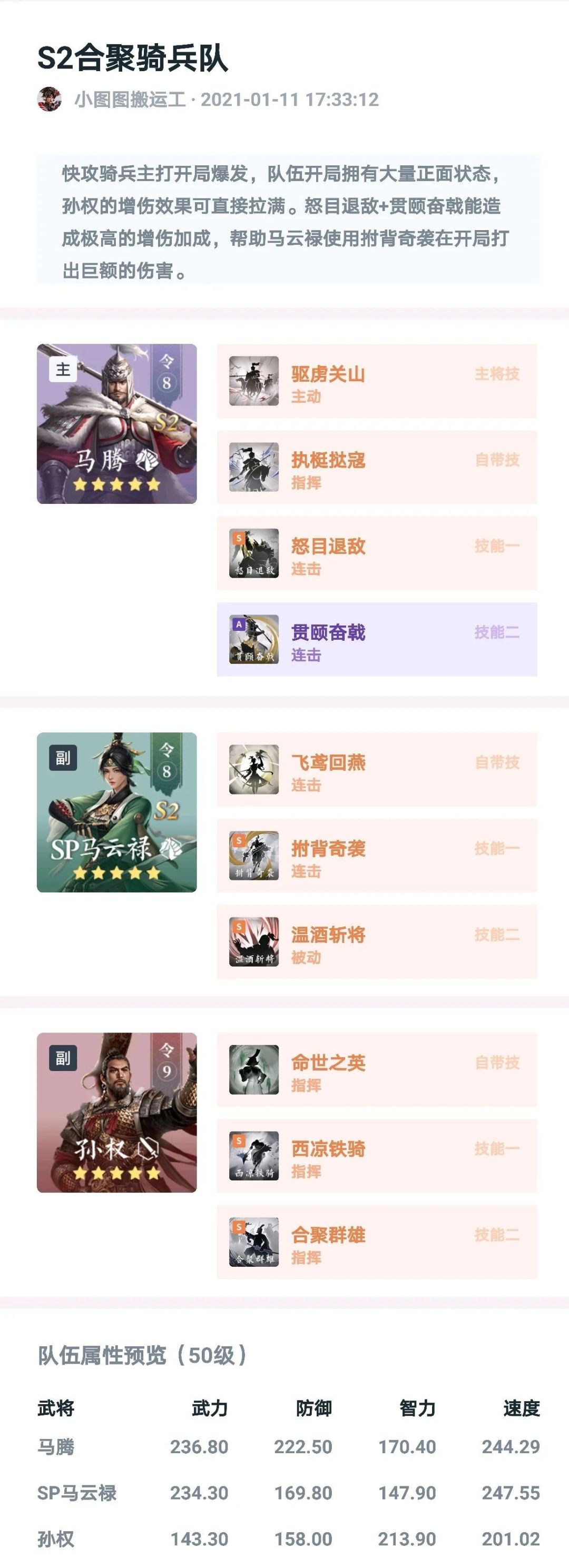快攻骑兵主打开局爆发,队伍开局拥有大量正面状态,孙权的增伤效果可直接拉满。怒目退敌+贯颐奋戟能造成极高的增伤加成,帮助马云禄使用拊背奇袭在开局打出巨额的伤害。