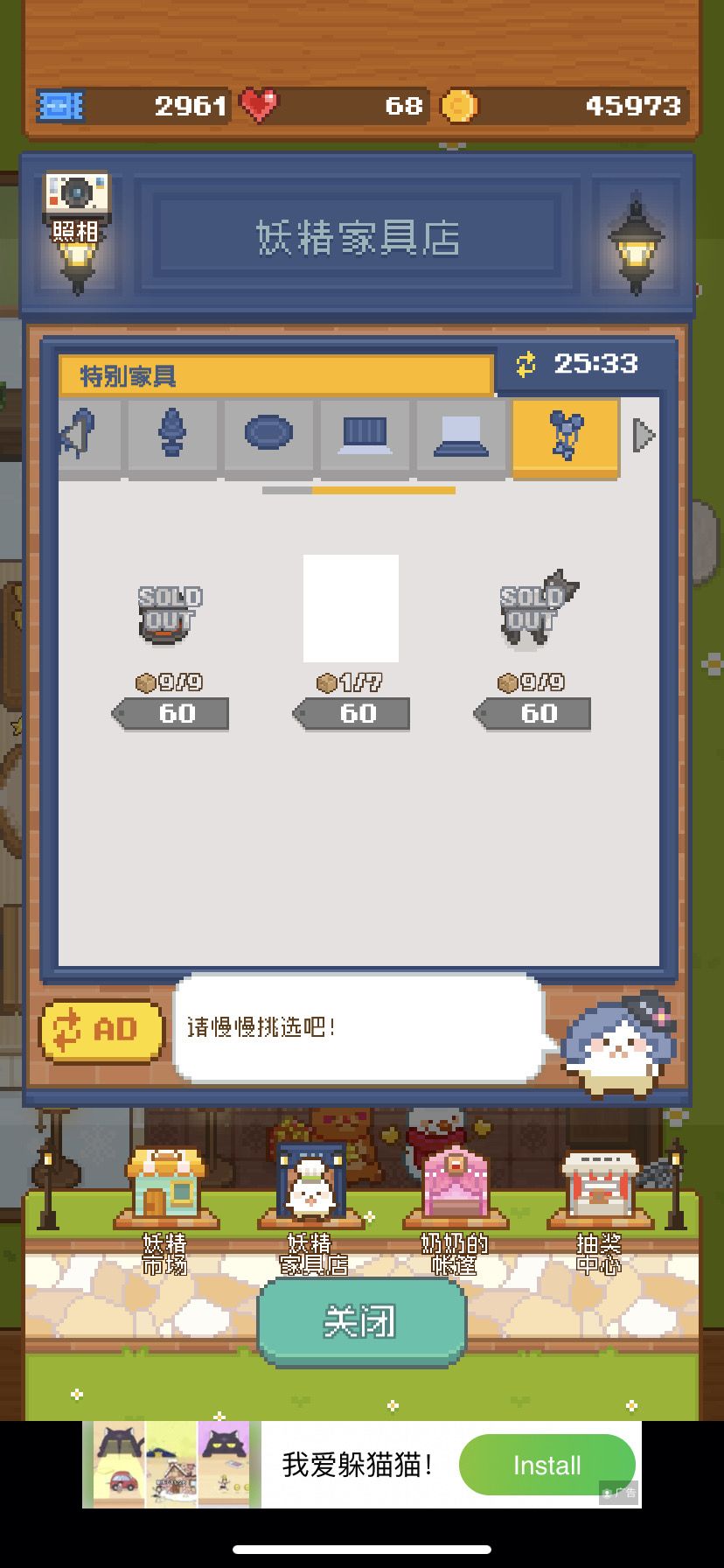 妖精家具店买的特殊家具,应该是圣诞的限定,但是显示不出来。装饰在店里也是空白的
