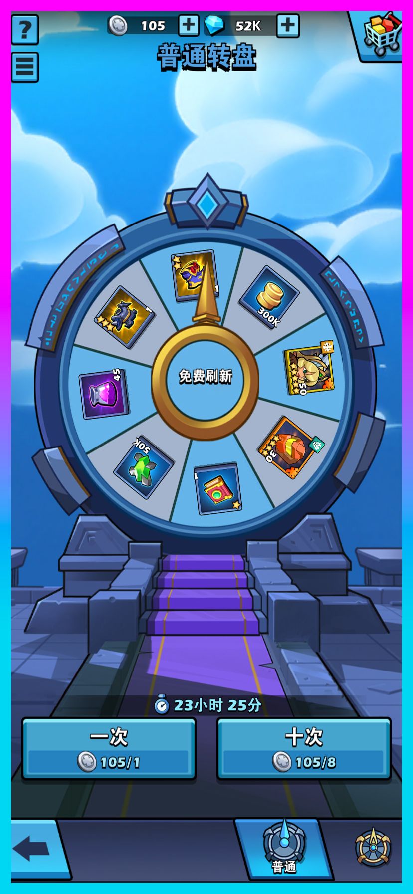 进入普通转盘,每次转转盘需要花费1或者8个命运银币,这里推荐10次十次的使用,10次=8个幸运币,比单次转更为划算,对于当前的奖励不满意可以进行免费的刷新。