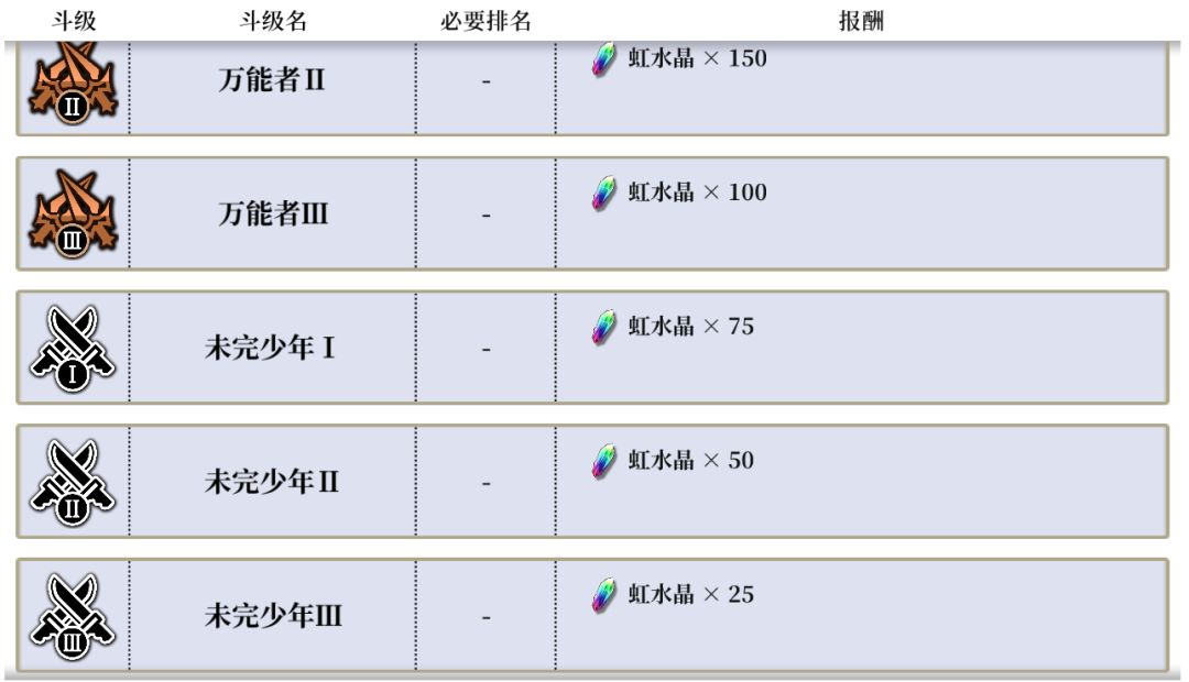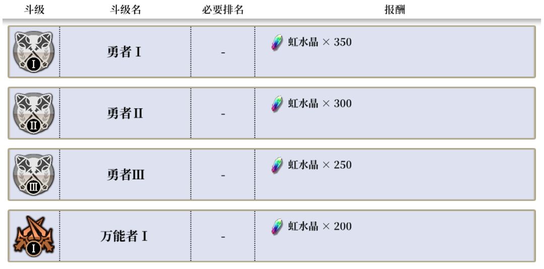 第一种【升级报酬】是指玩家对战获得积分,随着斗级的提升即可获得相对应的积分奖励,达到猛者段位以上即可获得英雄的恩惠,而在该段位以下的每一级都是10枚虹水晶奖励。