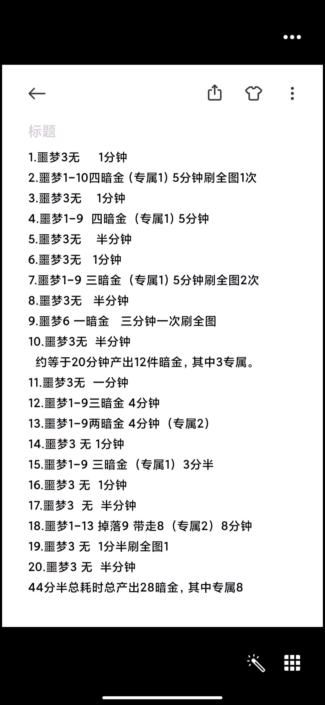 然后说手法,手法是可以节省很多时间的,下坑后遇到噩梦1-2是清全图直接退出,刷完噩梦3没掉暗金直接退出,噩梦6没掉装备且前面装备都有祭坛封装好了退出,噩梦9多了暗金直接快速去下一层找祭坛看见没有退出。