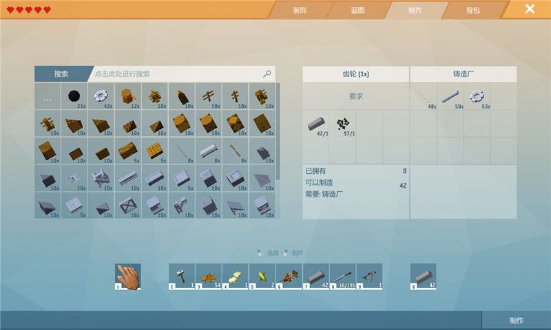 制作铸造厂所需材料:x30粘土、x20炉衬、x1铸模、x1任意锤子