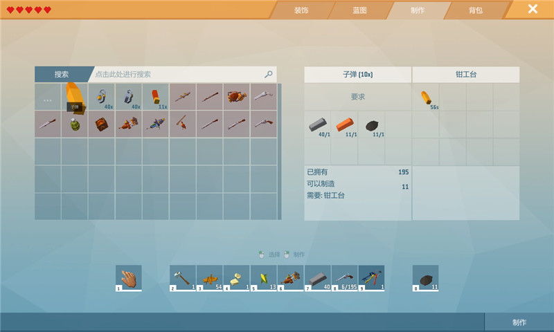 制作子弹所需材料:X1铁锭、x1铜锭、x1火药 (需要钳工台)