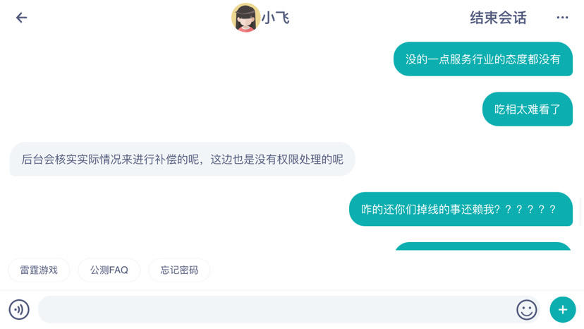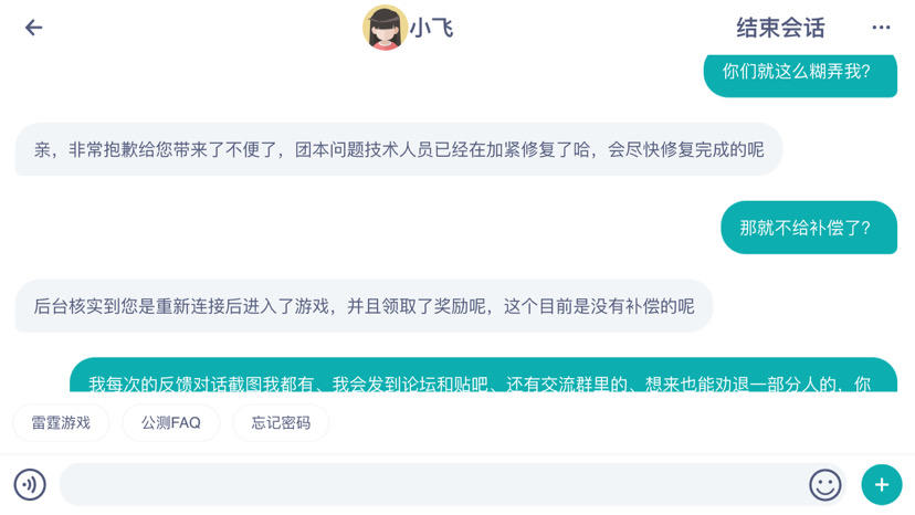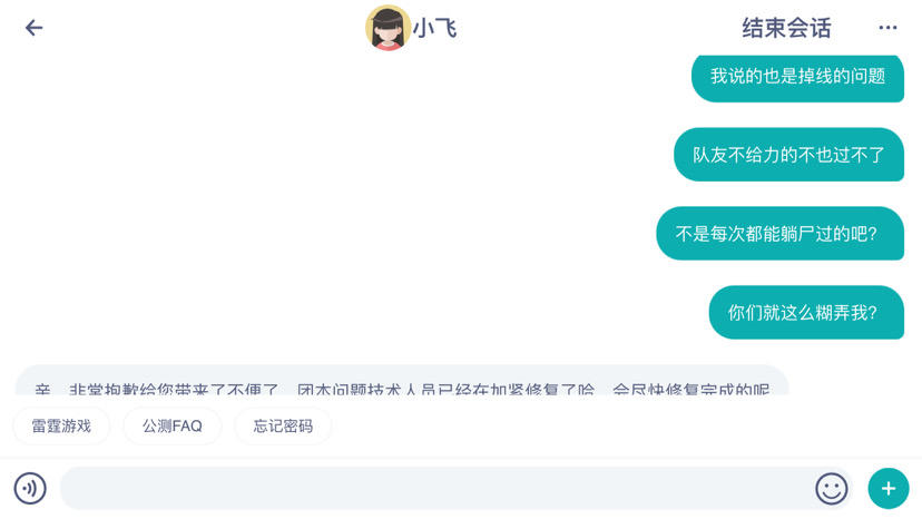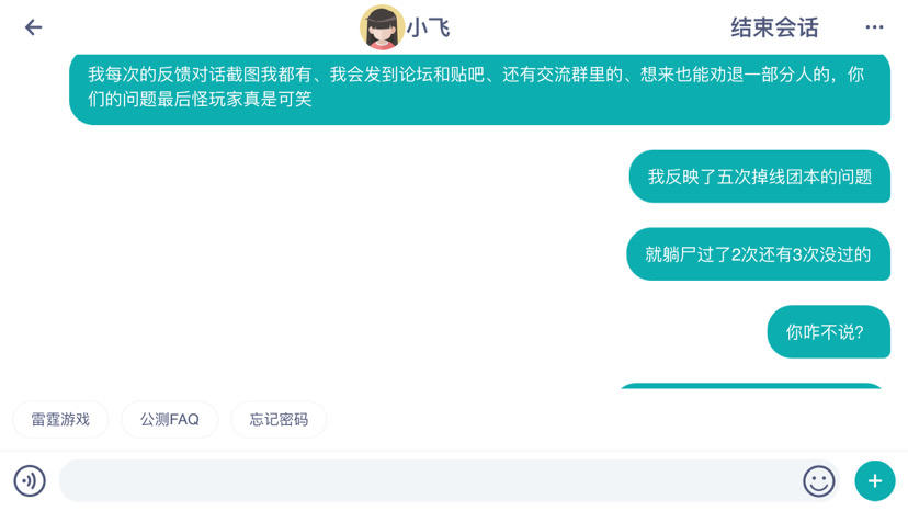 一直再说在修复掉线问题,可是我反映了五次了,三个星期的团本、这么长时间你们修复不好?有空出时装圈钱、没时间修复掉线,吃相能不能好看点,你们就靠着团本掉线劝退玩家吧?一次团一能掉个6-7次、那还玩个毛,有两次靠着队友给力躺尸过了两次、客服人员说检测到你断线重连之后过了领了奖励、你说气人不,那不过的三次呢、咋说,给玩家解决问题一直敷衍。下面有截图