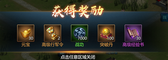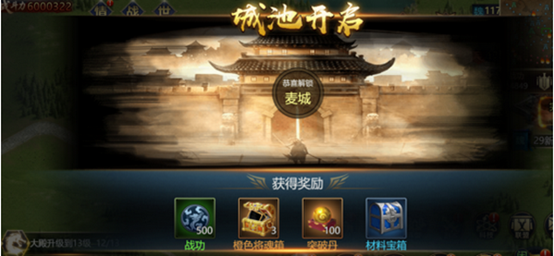 完成【麦城】的解锁后,主公可获得大量的奖励(战功、武将宝箱、突破丹、材料)