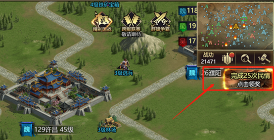 同时,解锁的城池越多,主公获得的奖励就越多;完成的民情任务越多,主公也可获得越多的任务奖励
