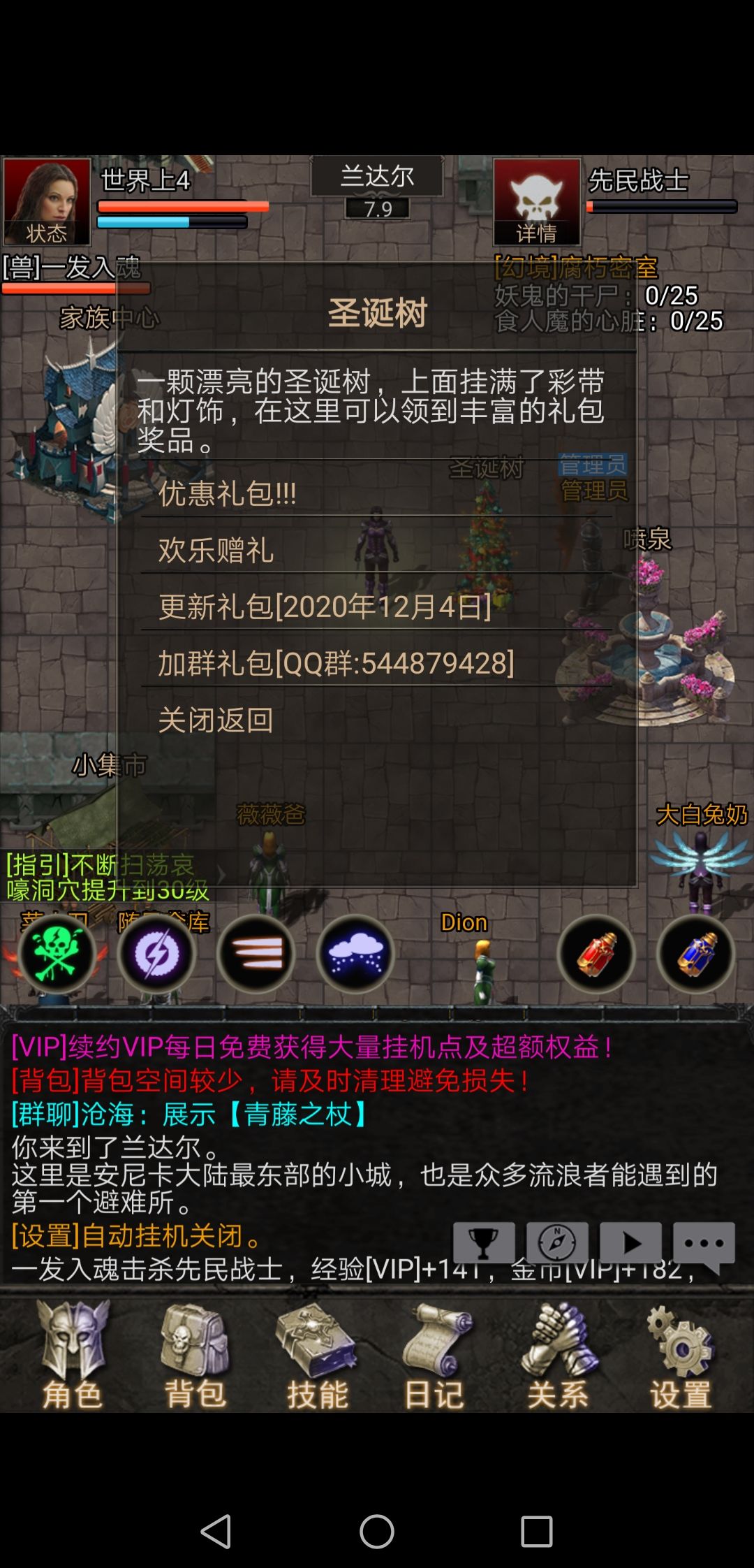 战士们在选择好名字,进入游戏后,按指导熟悉一下游戏的基础操作知识,第一次装备武器,第一次打怪,第一次酒吧接任务,第一次成就奖励,第一次购买技能,学习技能,设置挂机技能,血量魔药比率。基础知识熟悉后可上手游戏打开挂机打怪升级。同时点设置返回游戏角色登录口进行角色二次进入,激活帐号》绑定的手机号,短信验证码》在验证码激活后,进入游戏,操作角色升级到10级后回到广场,找到圣诞树领取礼包兑换码5678领取丰厚的礼物