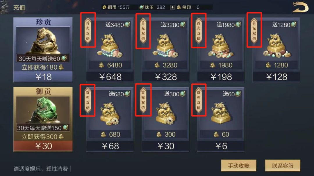 充值界面所有的标价充值都可以购买一次,因为都是双倍奖励的额,再次购买只有1.3倍。第一次购买都是2倍!↓↓