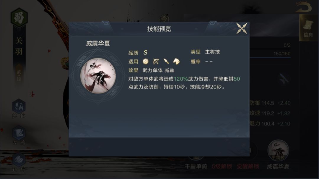 主将技-威震华夏:武力伤害类技能,附带削弱一个武将的面板属性,攻防兼备。↓↓