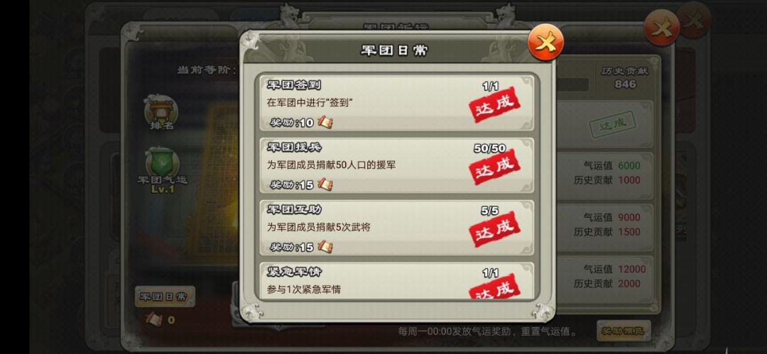 通常大家肯定能完成的是捐献,签到,捐兵,国战,军团战,至于其他的任务,根据我刷祈运的经验(没额外用元宝刷的情况下曾经连续5周霸榜),有以下几个小建议,供军团负责人和大家参考