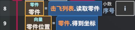 拖动“变量功能/击飞列表/读取零件”,参数填写i,返回值命名为“零件”,如图