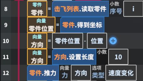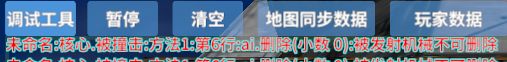 这个语句的意思是:在手雷为圆心,半径为2的球型区域查找零件(每个机械只找一个零件即可),得到的所有零件都放入一个名字叫“击飞列表”的列表,列表可以理解为多个变量排成的一个队伍,列表中的变量可以是零件、小数、文字等任意类型。最后我们还需要点击右上角的“调试信息”开关,这样我们在游戏中就可以看到代码运行的具体过程了。现在进入测试