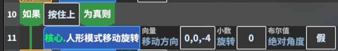 可是如果这时进入测试会发现,AD的旋转都是正常的,但一旦旋转后,按住W没有想着朝向的方向前进而是一直朝着地图的上方移动,这时因为“移动方向”这个参数是“世界空间”的朝向,而我们需要的效果是朝着人物自身的向前方向移动。这就需要将雪球这个物体的局部空间的方向转换到世界空间。这里我们可以方便的使用游戏自带的功能:拖动上方的“当前零件”按钮到第10行后面,选择“位置/局部方向到世界”方法,返回值名称叫做“方向”即可,“局部方向”这个参数我们填写0,0,-4,这代表从“核心”这个零件的视角看过去向前的方向,而这个方法的返回值就是经过转换后的世界方向了