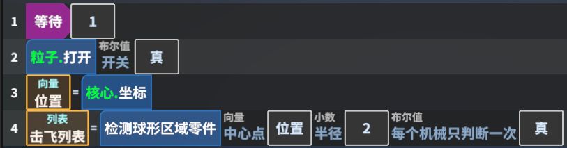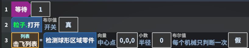 再进入测试,可以发现敌人是陆续产生的了,现在我们朝着敌人发射手雷,并没有预想的击飞效果,因为我们之前只添加了粒子特效,现在我们回到“手雷”这个别名的机械产生器,并打开“机械启动”事件中的方法1,并在“粒子.打开”语句后增加“系统调用/系统/检测/检测球形区域零件”,返回值的名字设置为“击飞列表”